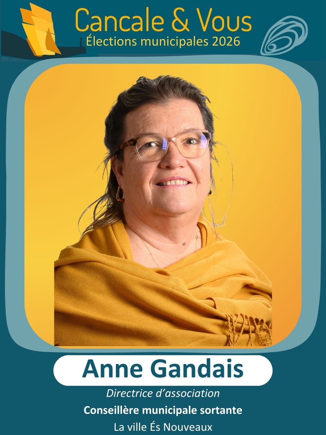 Je suis Anne Gandais, 58 ans, Cancalaise depuis 27 ans, habitante du quartier de la Ville es Nouveau. Directrice à temps partiel d’une association du secteur touristique social et solidaire, impliquée depuis toujours dans la vie associative, je suis aussi engagée depuis plus de 20 ans dans la vie locale, d’abord comme adjointe, puis comme conseillère municipale et communautaire.